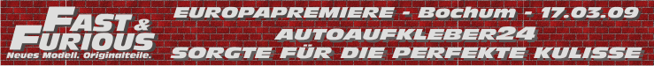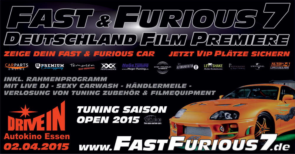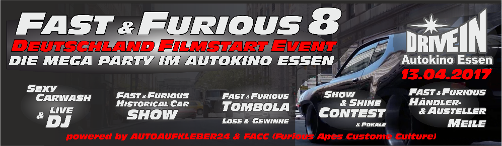 Eigentlich wollten wir Euch an dieser Stelle Informationen zur Europa Film Premiere von Fast & Furious 7 in Berlin am 15.03.2015 bekanntgeben . Eigentlich sollten dort auch wieder die Filmstars persönlich erscheinen und wir sollten eigentlich wieder die Fahrzeuge für den roten Teppich per Casting finden. Soweit war auch alles bestens vorbereitet und kurz vor der Veröffentlichung und dem Start des Castings erreichte uns dann von Universal Pictures die traurige Nachricht, dass alle Premierenevents von Fast & Furious 7 für Berlin, Abu Dhabi und Argentinien nicht stattfinden werden. Es wird sich jetzt auf einen grosses Event in Los Angeles konzentriert. Glücklicherweise sind wir jedoch seit Dezember mit Vorbereitungen der Film Premiere von Fast & Furious 7 im Autokino Essen beschäftigt und werden Euch dort eine geniale Premierenparty bieten: Schaut einfach mal rein: |