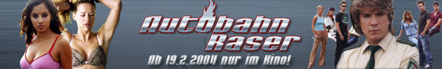 | Macht Euch bereit für die Komödie des Jahres: AUTOBAHNRASER, das High-Speed-Kinoereignis mit einem Großaufgebot junger, aufregender Gesichter: Luke J. Wilkins, Manuel Cortez, Niels Bruno Schmidt, Alexandra Neldel, Henriette Richter-Röhl und Viva-Moderatorin Collien Fernandes, die mit ihren hochgetunten Flitzern die Autobahn zu ihrem Spielplatz machen. Basierend auf dem gleichnamigen, millionenfach verkauften Videospiel von Davilex bringt Constantin Film ab 19. Februar 2004 die AUTOBAHNRASER auf die große Kinoleinwand. | ||||||||||||